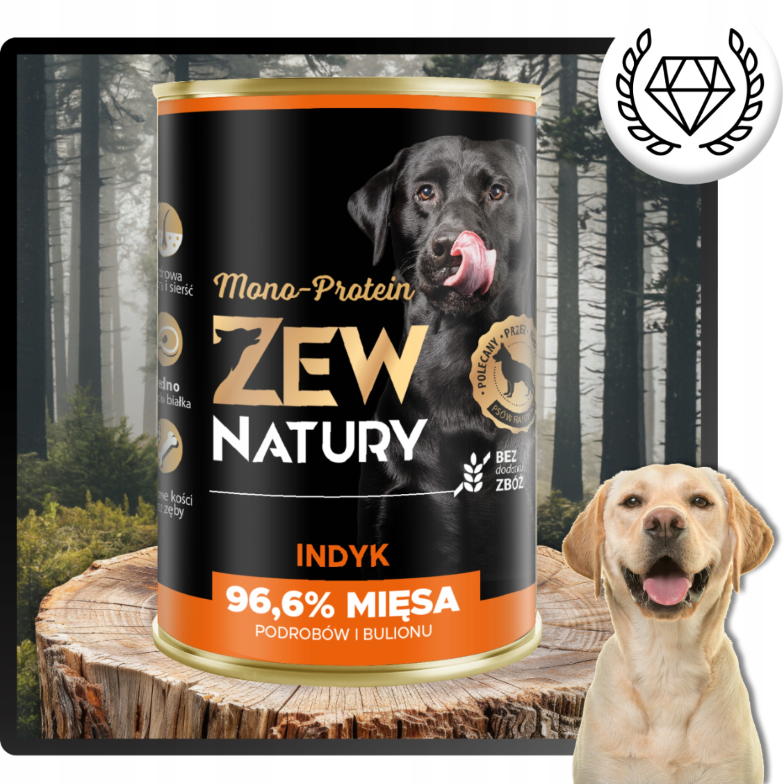 Karma Zew Natury MONO-PROTEIN zawiera 68% indyka, bulion z indyka, bataty, olej z łososia, bazylia i ekstrakt Yucca Mojave.