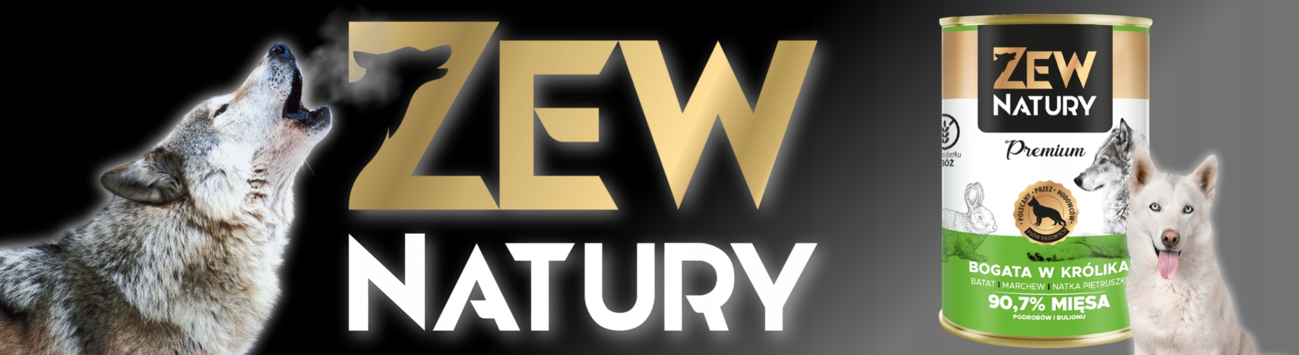 Karma Zew Natury zawiera 50% wieprzowiny, 14% królika, bulion króliczy, batat, marchew, olej z łososia i nać pietruszki.