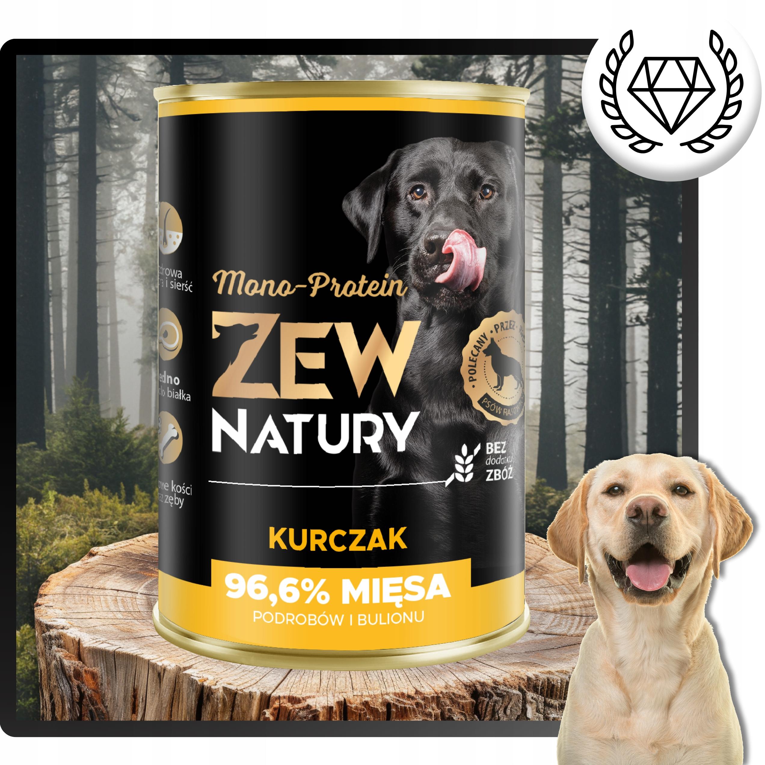 Karma Zew Natury MONO-PROTEIN zawiera 68% kurczaka, bulion z kurczaka, jabłko, olej z łososia, rumianek i ekstrakt Yucca Mojave.