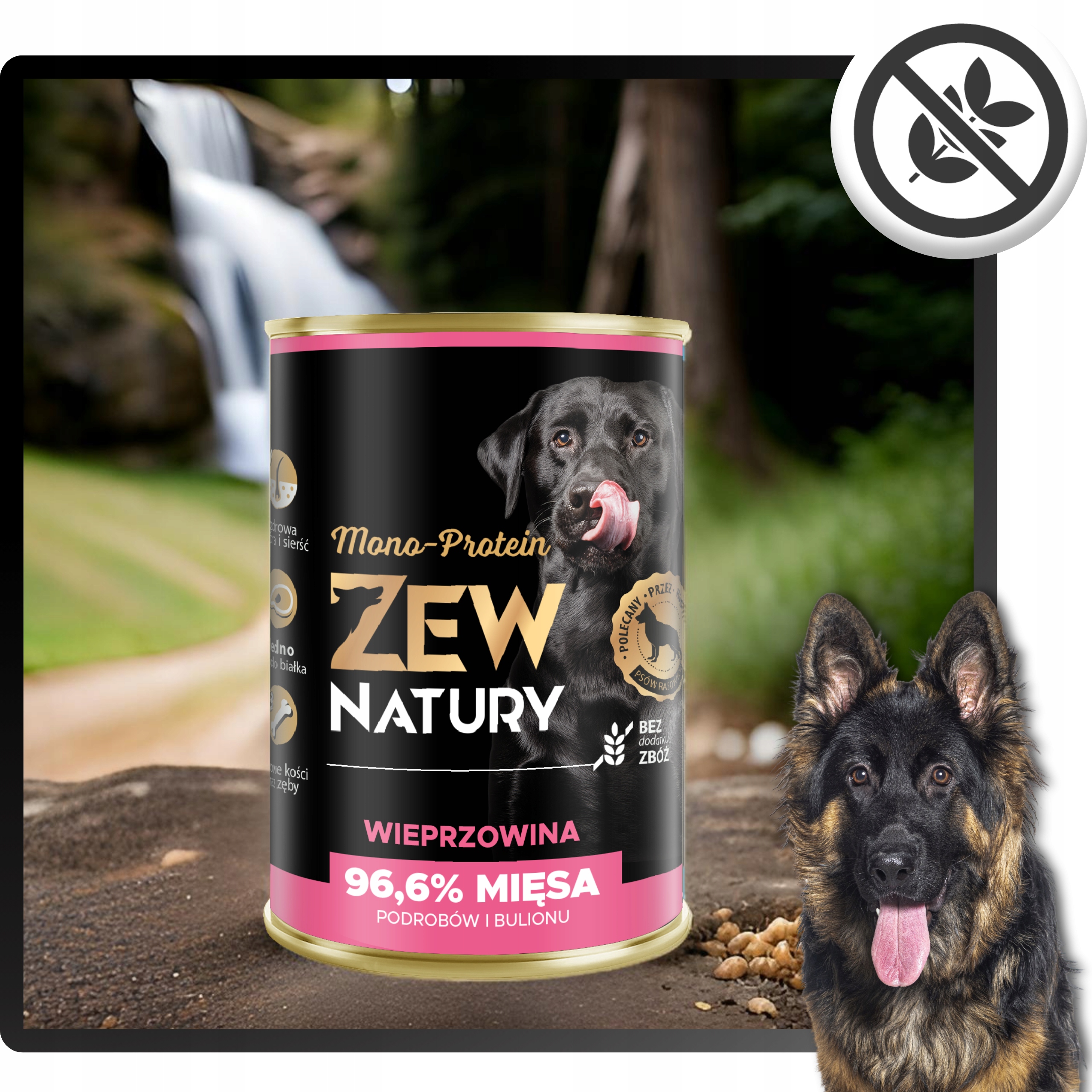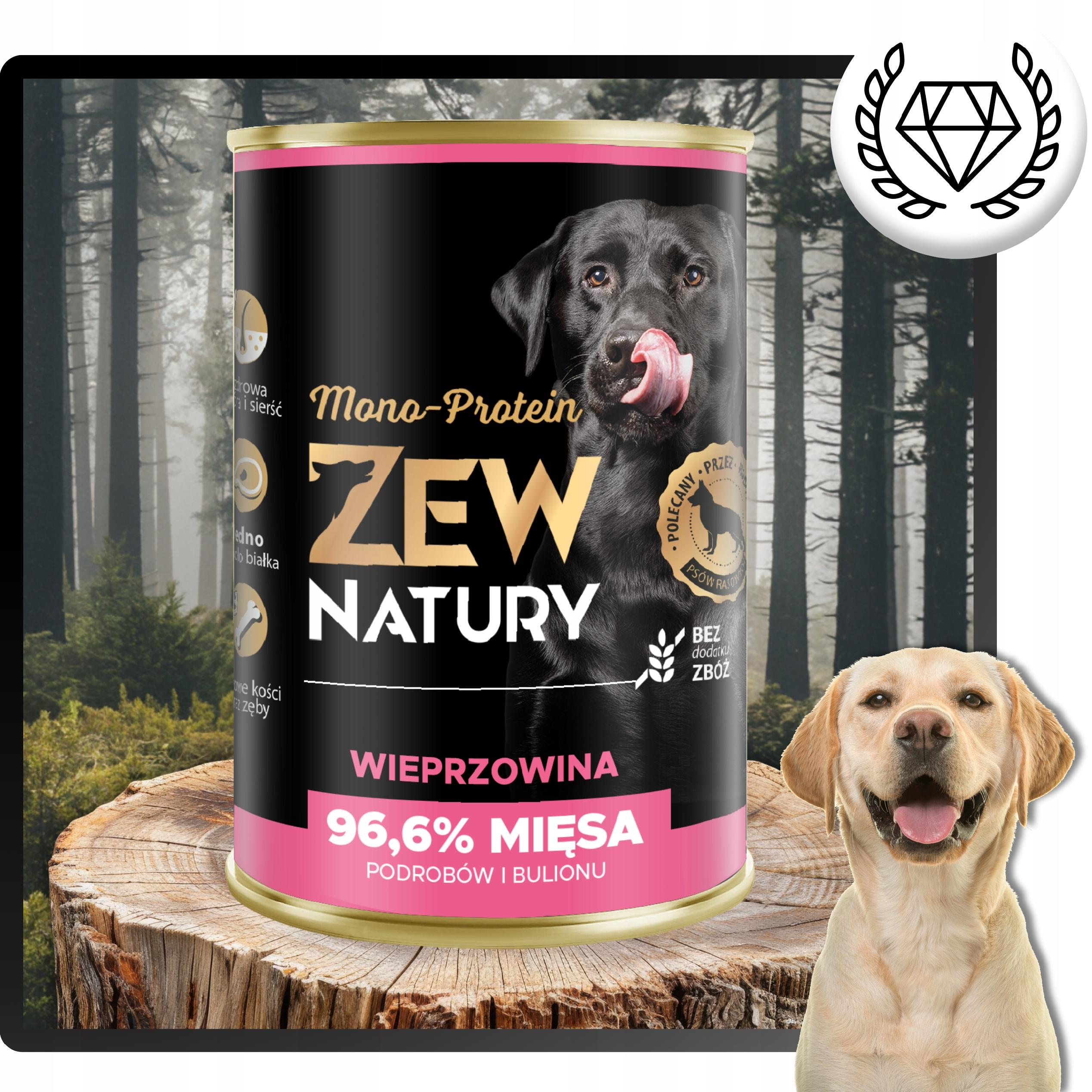 Karma Zew Natury MONO-PROTEIN zawiera 68% wieprzowiny, bulion wieprzowy, marchewkę, olej z łososia, tymianek i ekstrakt Yucca Mojave.
