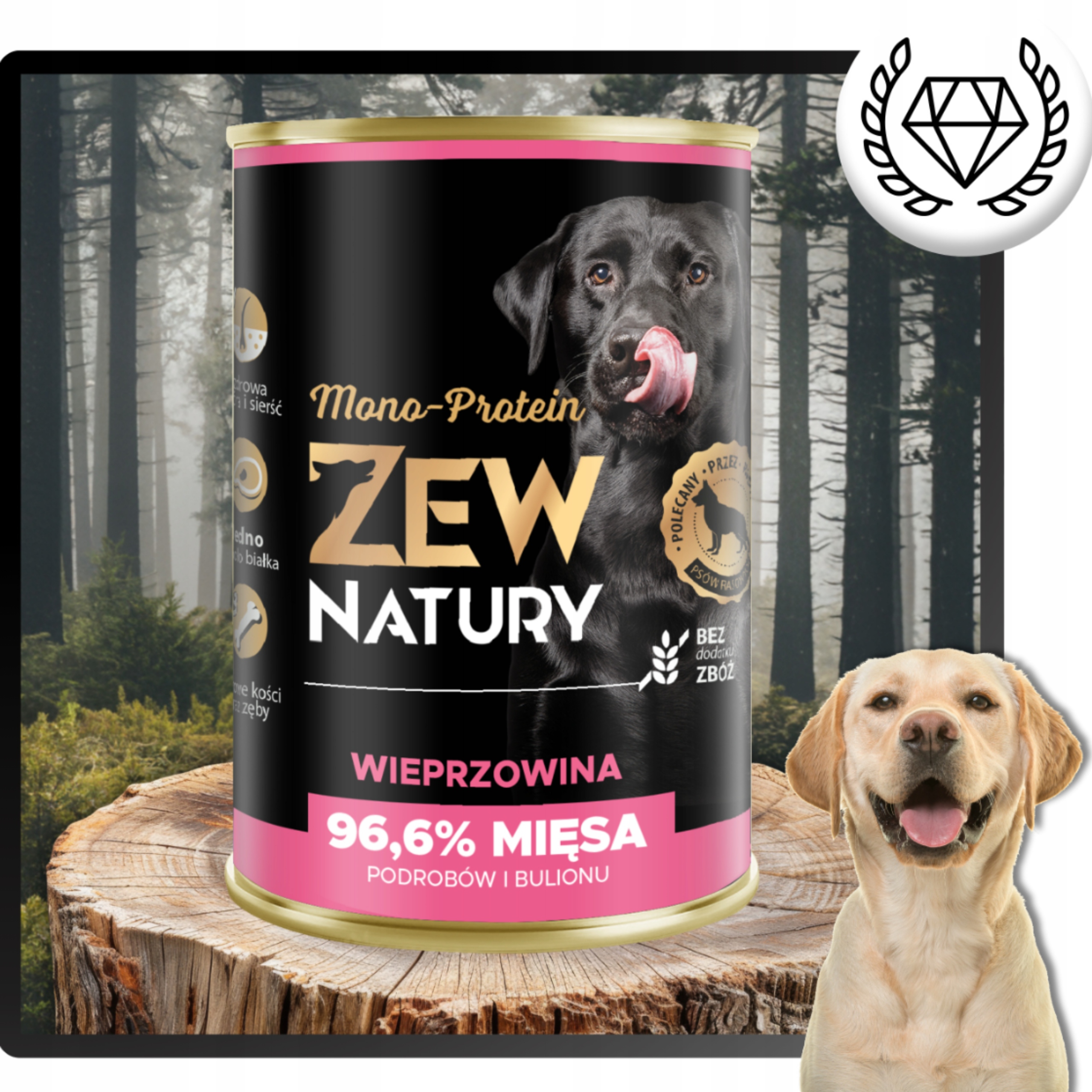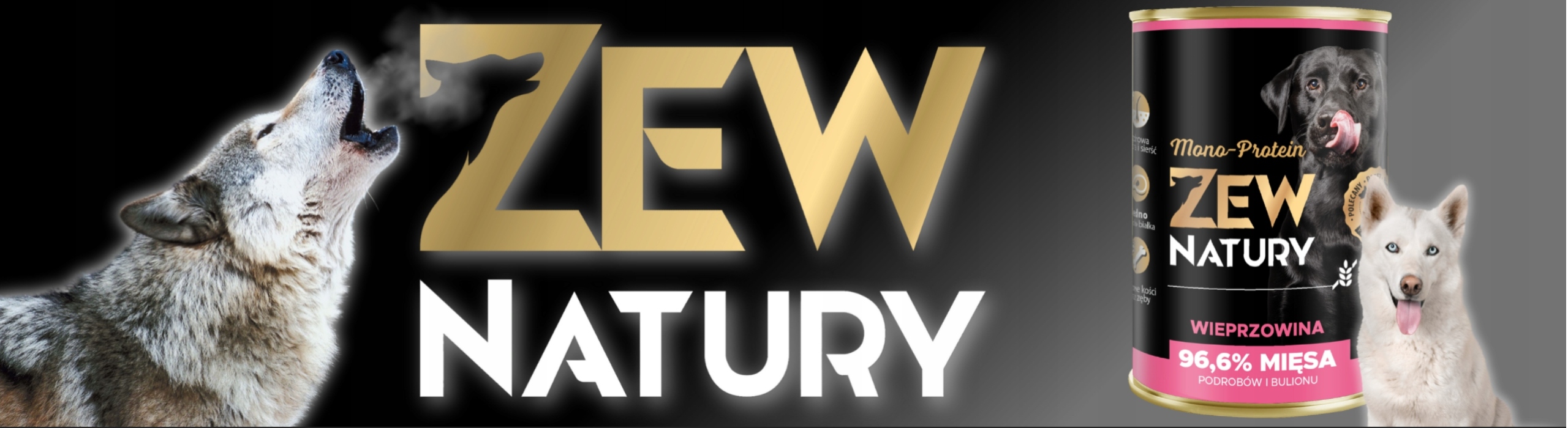 Karma Zew Natury MONO-PROTEIN zawiera 68% wieprzowiny, bulion wieprzowy, marchewkę, olej z łososia, tymianek i ekstrakt Yucca Mojave.