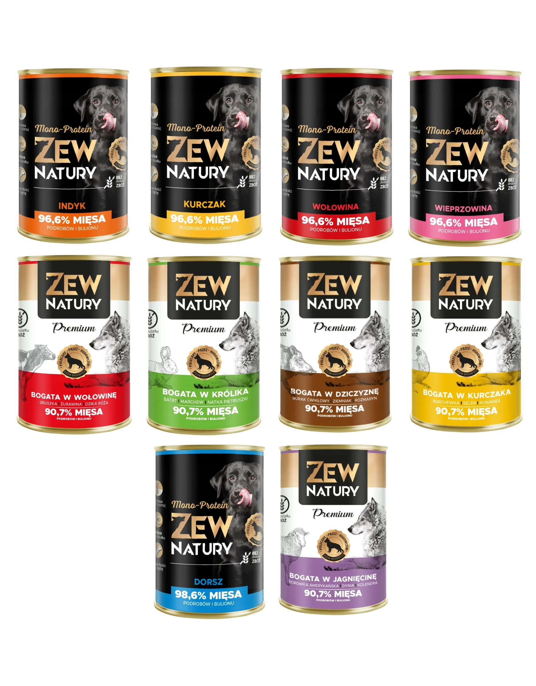 Zróżnicowany zestaw 10 puszek mokrej karmy dla psów - 10 smaków z dwóch linii: MONO-PROTEIN (jedno źródło białka) oraz PREMIUM „Bogata w”.